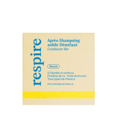 L'après-shampoing solide bio Respire est formulé sans ingrédients chimiques pour apporter un petit plus à votre chevelure : douceur, démêlage et cheveux brillants 😊