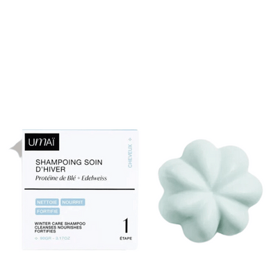 Le Shampoing Soin d'Hiver d'Umaï est un soin en édition limitée à l'Edelweiss bio des Hautes-Alpes. Sa formule riche en huiles végétales nourrit et hydrate les cheveux secs et fragilisés, tout en leur donnant de la brillance et du volume. Sa jolie forme de fleur couleur glacier naturelle, au toucher satiné, et son parfum doux et réconfortant vous charmeront. Sans allergènes, ni gluten, ni huiles essentielles, ce shampoing solide offre une mousse généreuse et crémeuse.