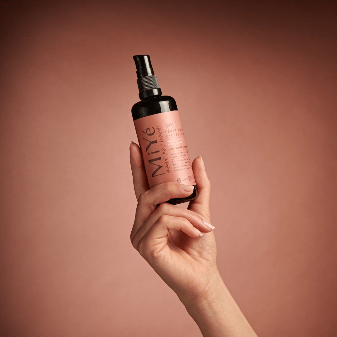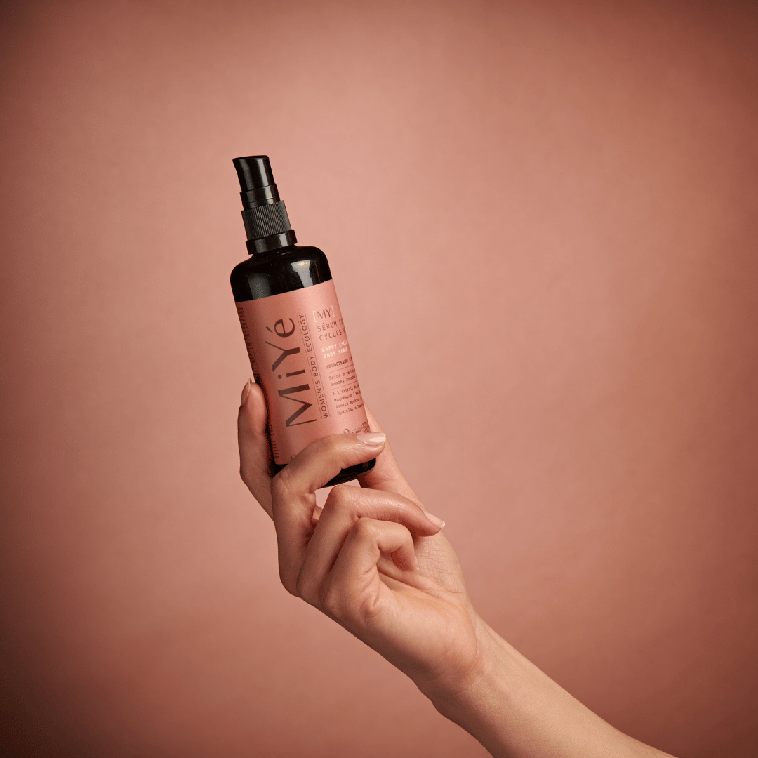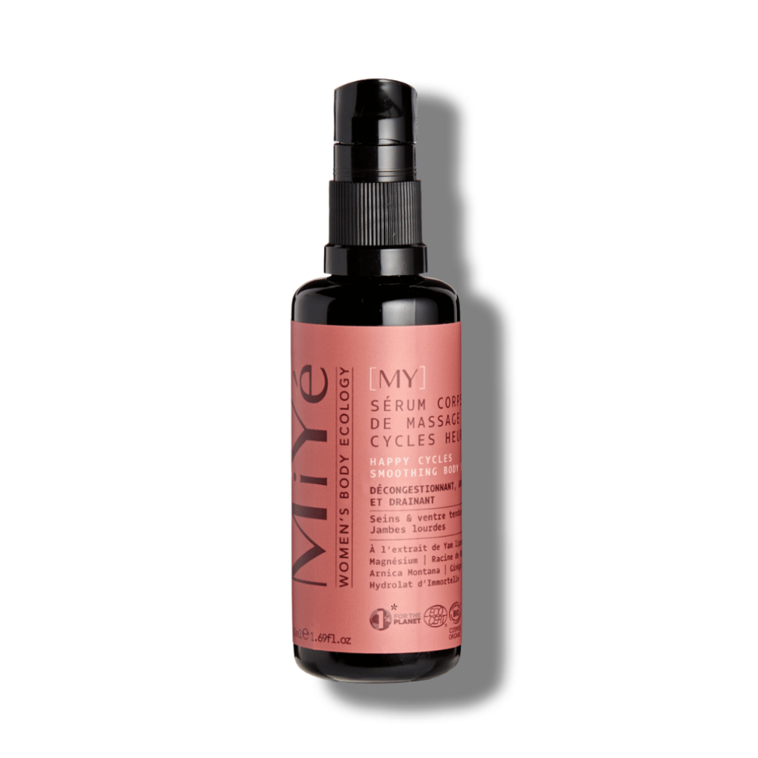 Le Sérum Corps Cycles Heureux de la marque Miyé est un soin hydratant certifié bio qui contient des actifs naturels anti-inflammatoires, adoucissants et drainants. Il est conçu pour apaiser les zones tendues du corps durant les règles, le post-partum, la ménopause ou encore le syndrome prémenstruel. Il est vegan et noté excellent sur Yuka et contient aucune huile essentielle, parfum ou ingrédients controversés.
