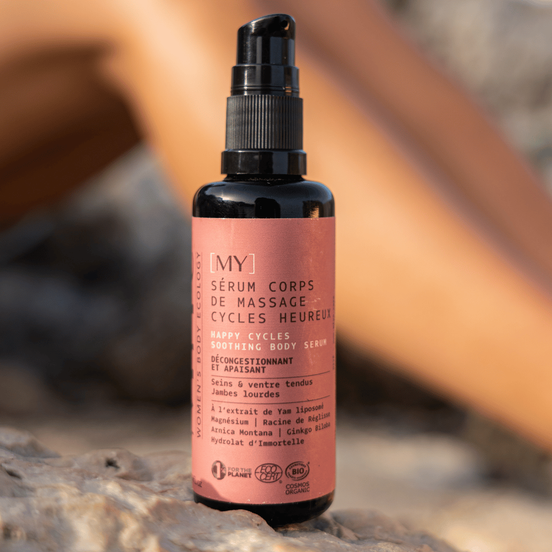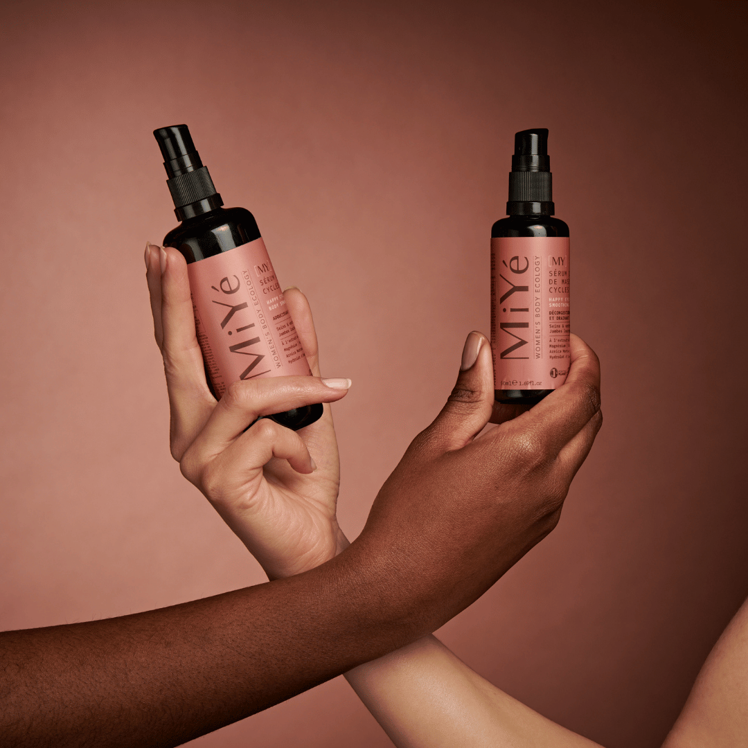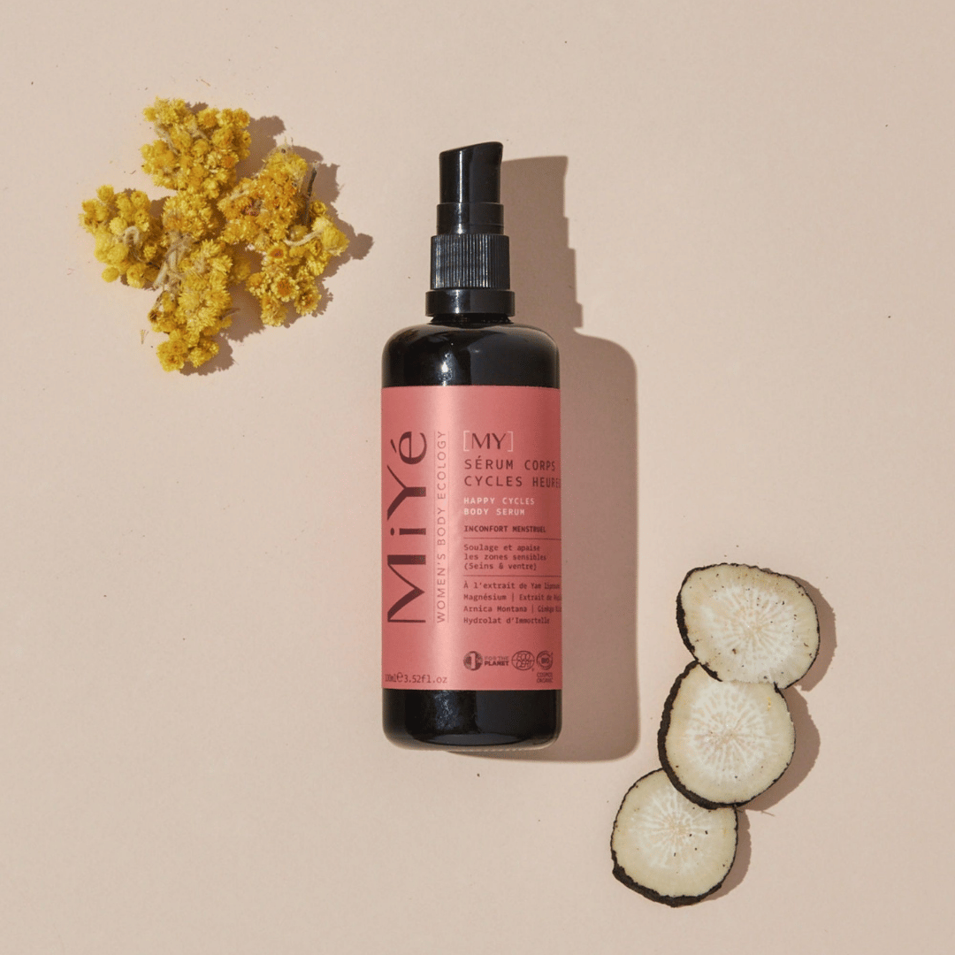 Le Sérum Corps Cycles Heureux de la marque Miyé est un soin hydratant certifié bio qui contient des actifs naturels anti-inflammatoires, adoucissants et drainants. Il est conçu pour apaiser les zones tendues du corps durant les règles, le post-partum, la ménopause ou encore le syndrome prémenstruel. Il est vegan et noté excellent sur Yuka et contient aucune huile essentielle, parfum ou ingrédients controversés.